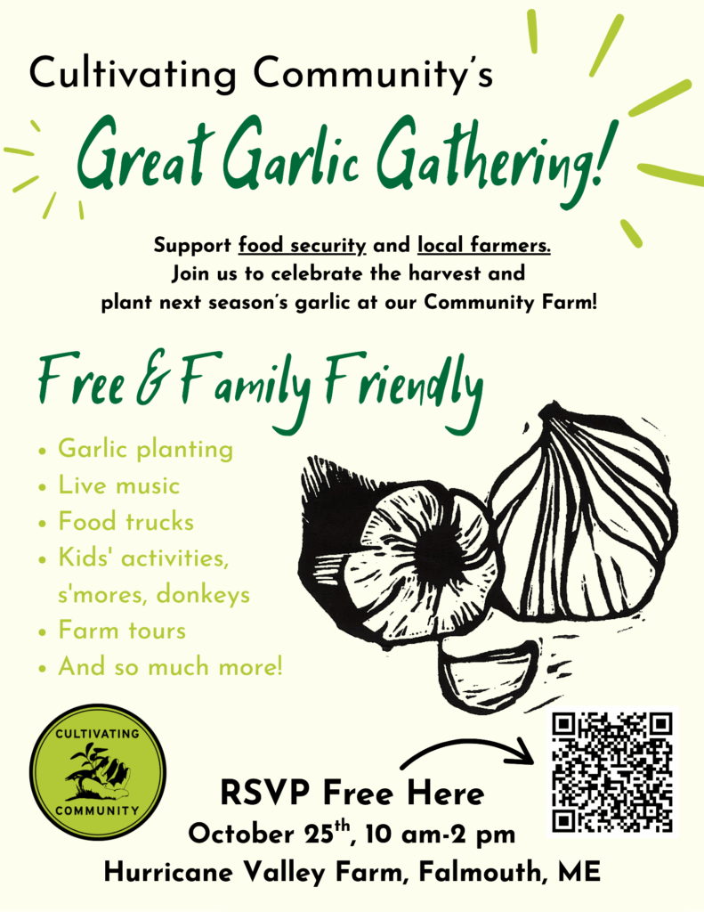 Join us at Hurricane Valley Community Farm to celebrate the harvest season and help plant next year’s garlic harvest. This free, family-friendly event is a benefit to support local food security and farming families. See you there!