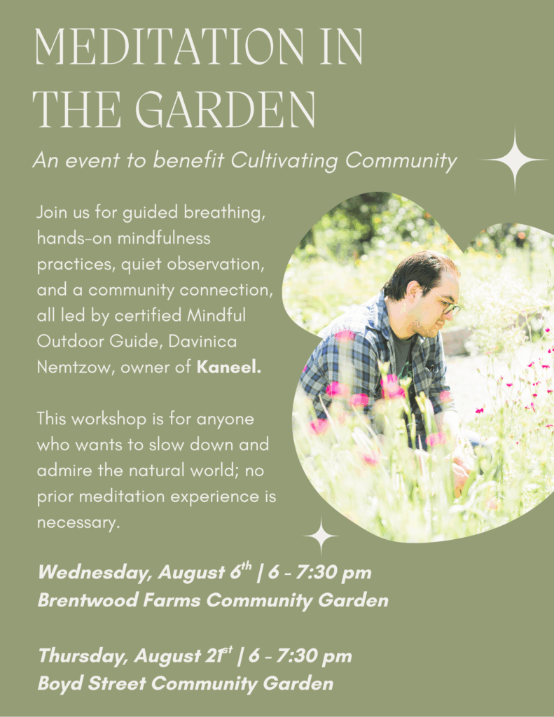 Through guided breathing, hands-on mindfulness practices, quiet observation, and a community sharing circle, this offering will help you cultivate a deeper relationship with the garden, your neighbors, and your own sense of well-being.